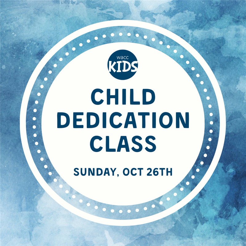 This class on October 26th is meant to prepare families for Child Dedications on Sunday, November 23rd. Please register for this class if you would like to dedicate your child(ren) at WACC on this date. Registration is free. Child dedication is a time when parents are invited to present their children to the Lord. The focus is on the children, whom the parents aim to raise up in the family of Christ. The children are prayed for and given a blessing from the whole WACC community. While no parent is perfect, families are encouraged to pursue spiritual parenting as they dedicate their children. They are confirming their intention to pray, love, teach, discipline, and direct their child in the truth of Scripture through the power of the Holy Spirit. It is recommended that all who participate in Child Dedications view WACC as their home church.